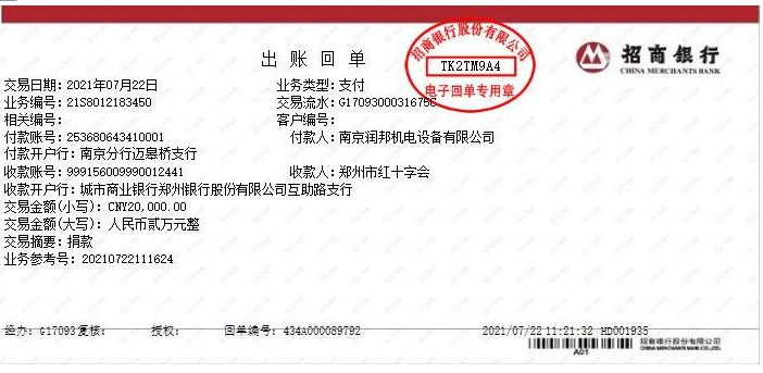 災(zāi)難面前,全國(guó)上下風(fēng)雨同行,同舟共濟(jì)。7月22日,潤(rùn)邦公司決定盡我們的綿薄之力馳援河南,通過(guò)鄭州市紅十字會(huì)捐款人民幣兩萬(wàn)元整,用于保障受災(zāi)地區(qū)人民群眾的生命安全、緊急救災(zāi)物資采購(gòu)等,助力鄭州市防汛救災(zāi)工作。